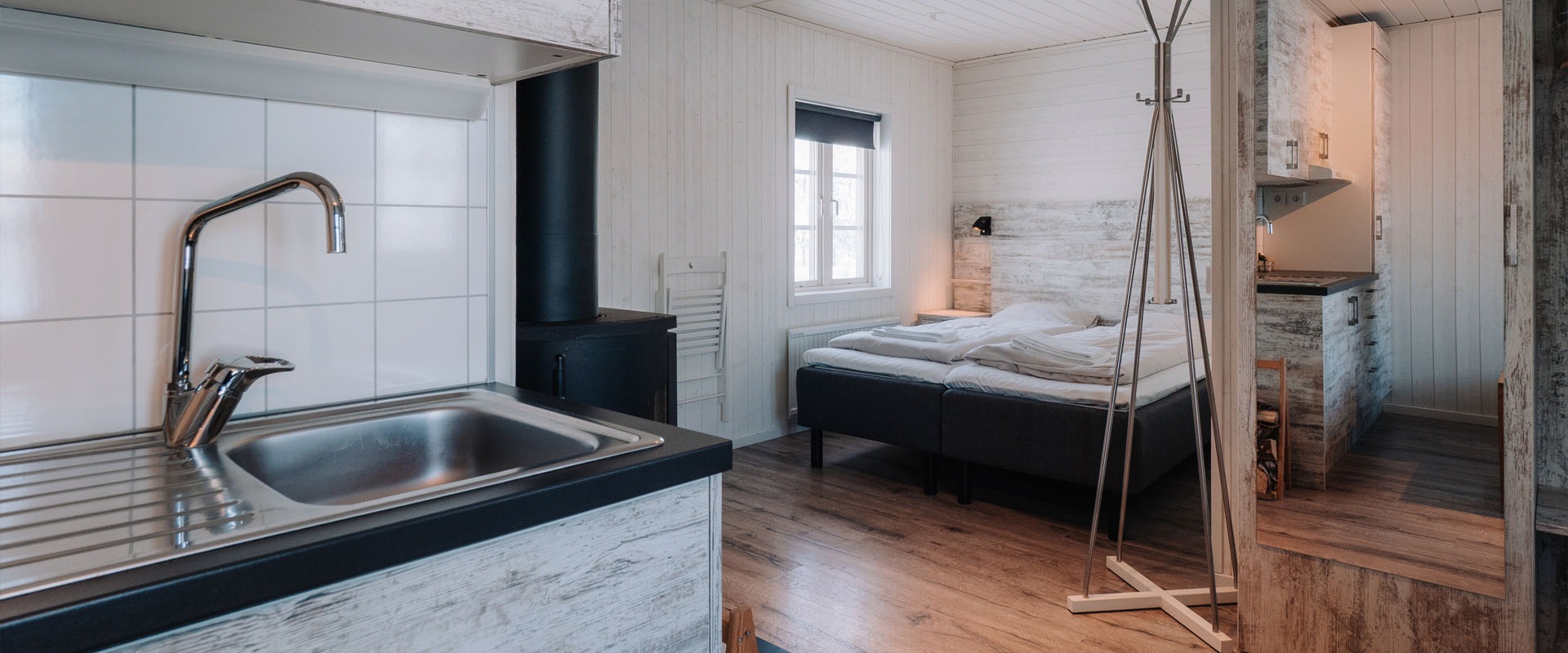 14 cabins with open floor plan. Each cabin has a double bed and a separate bedroom with a bunk bed. In the living room there is a kitchenette, sofa bed and fireplace. Bathroom with shower.