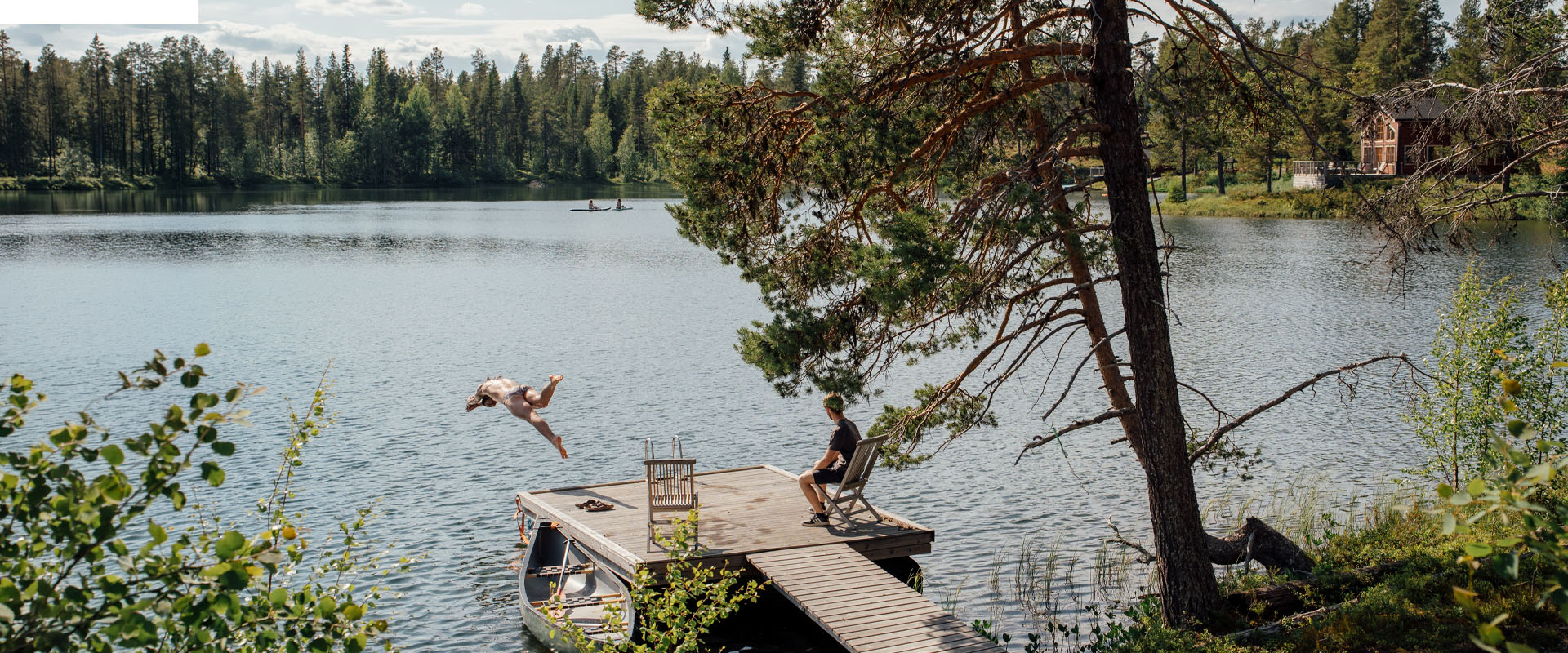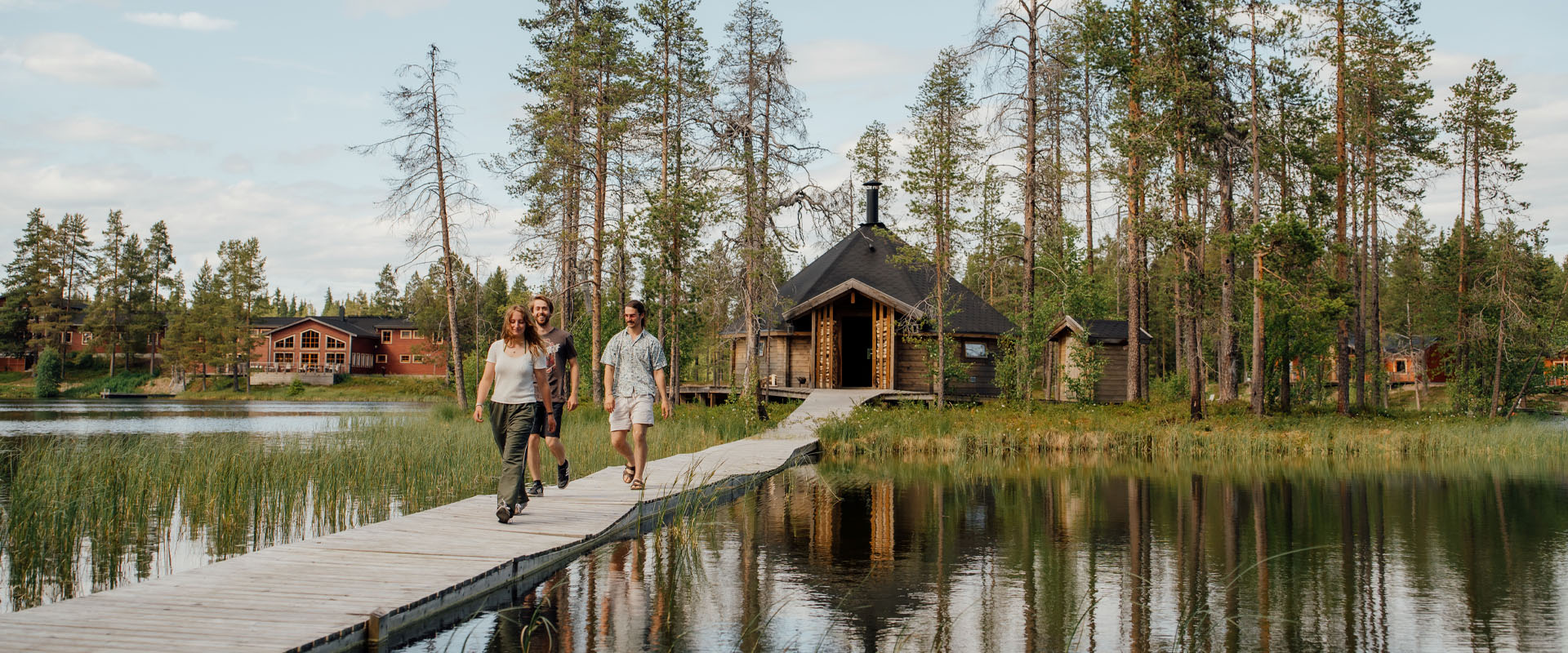 Pinetree Lodge is situated beside a beautiful lake, Saarijärvi, in the middle of a rich forest. Every afternoon we heat up the sauna. After activities you can relax, warm up, and enjoy the beautiful view. Before or after dinner, join us in the Brown Bear Bar for a locally brewed beer or a cloudberry sour. In our restaurant, join us for a delicious meal made from locally sourced food from Lapland. We offer the same amenities as a hotel, but in a family atmosphere.