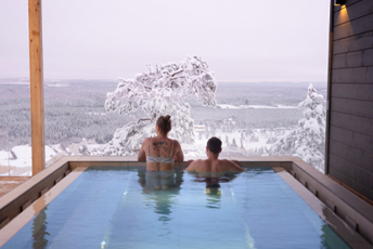 The spa and sauna area invites you to unwind, with indoor and outdoor pools overlooking the Arctic landscape.