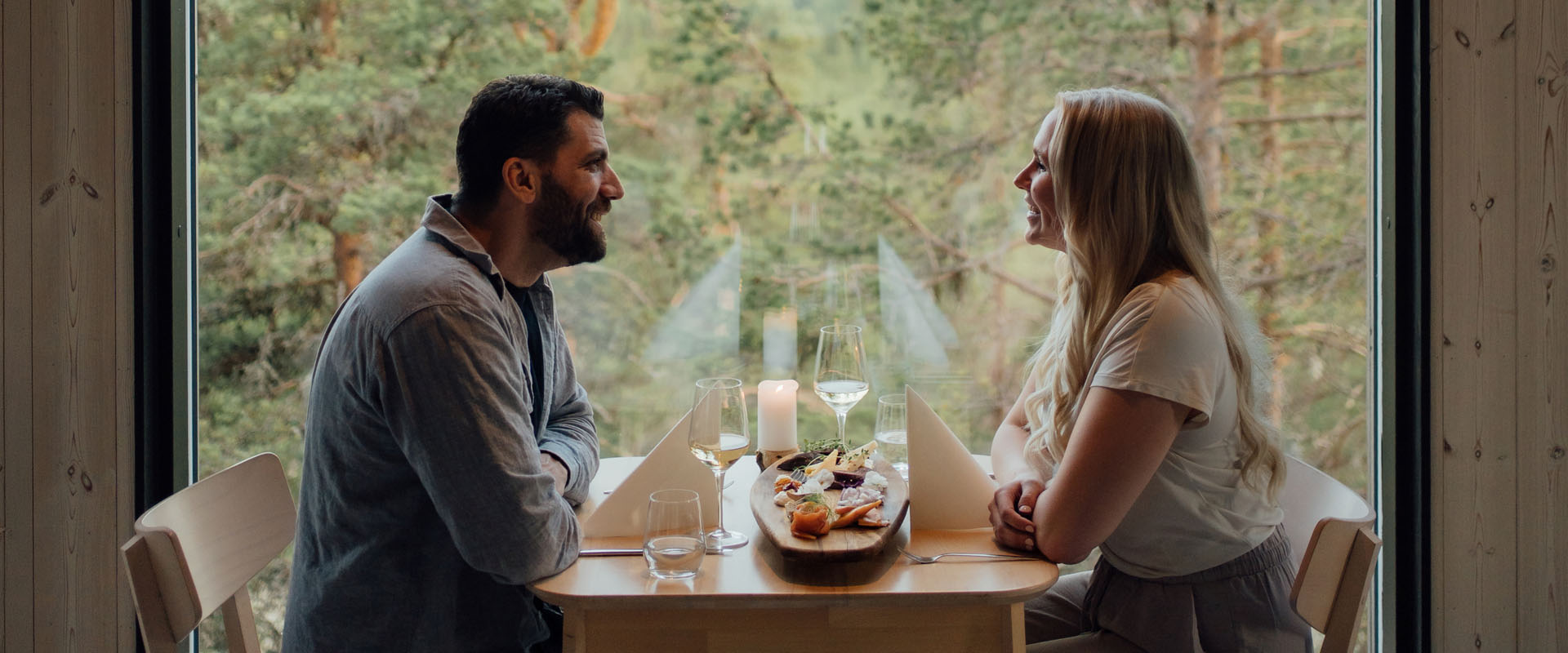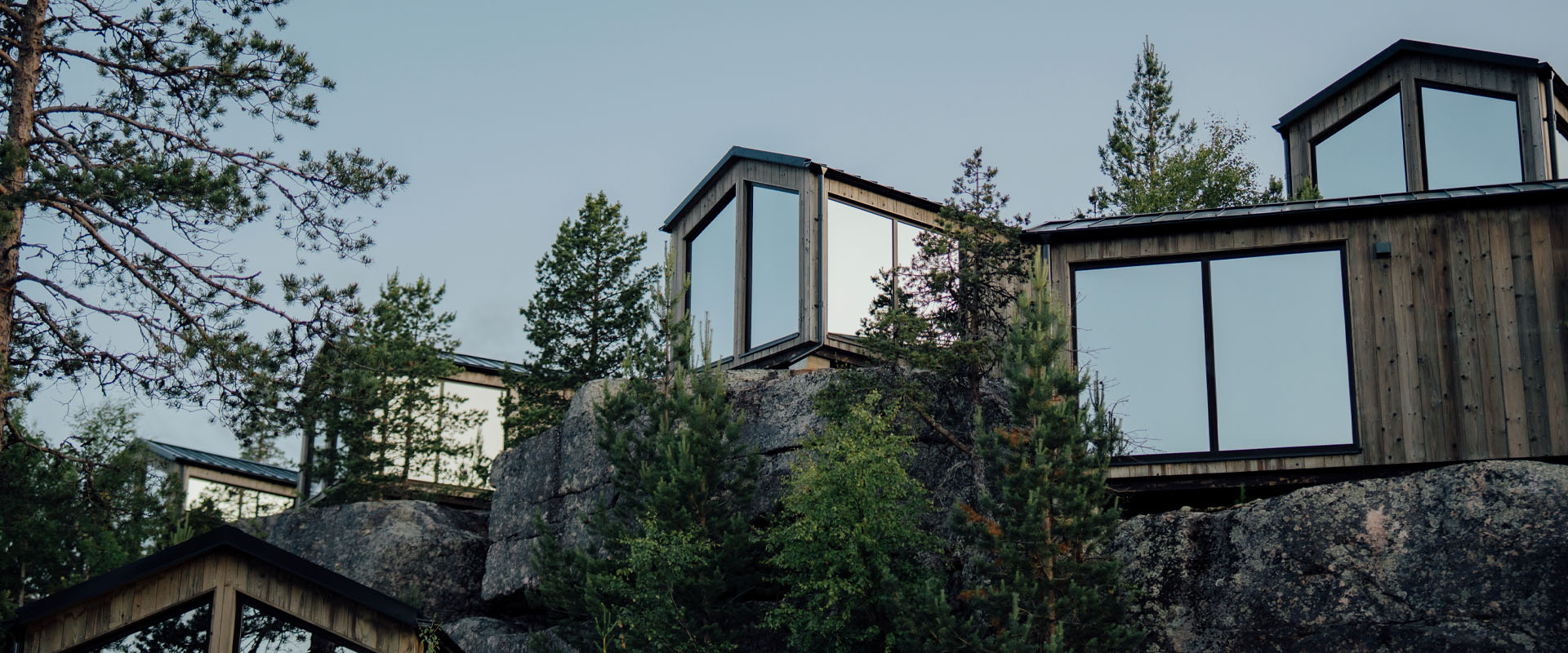 In the two main buildings with an adjoining terrace you'll find the reception, restaurant, bar and a cozy lounge with fireplace. In our restaurant we embrace the local cuisine and serve meals with local ingredients from Lapland. The buildings and spa area as well as the 40 hotel cabins have big windows for you to fully enjoy the breathtaking views over the snowy treetops, the Torne River Valley and the wide area.