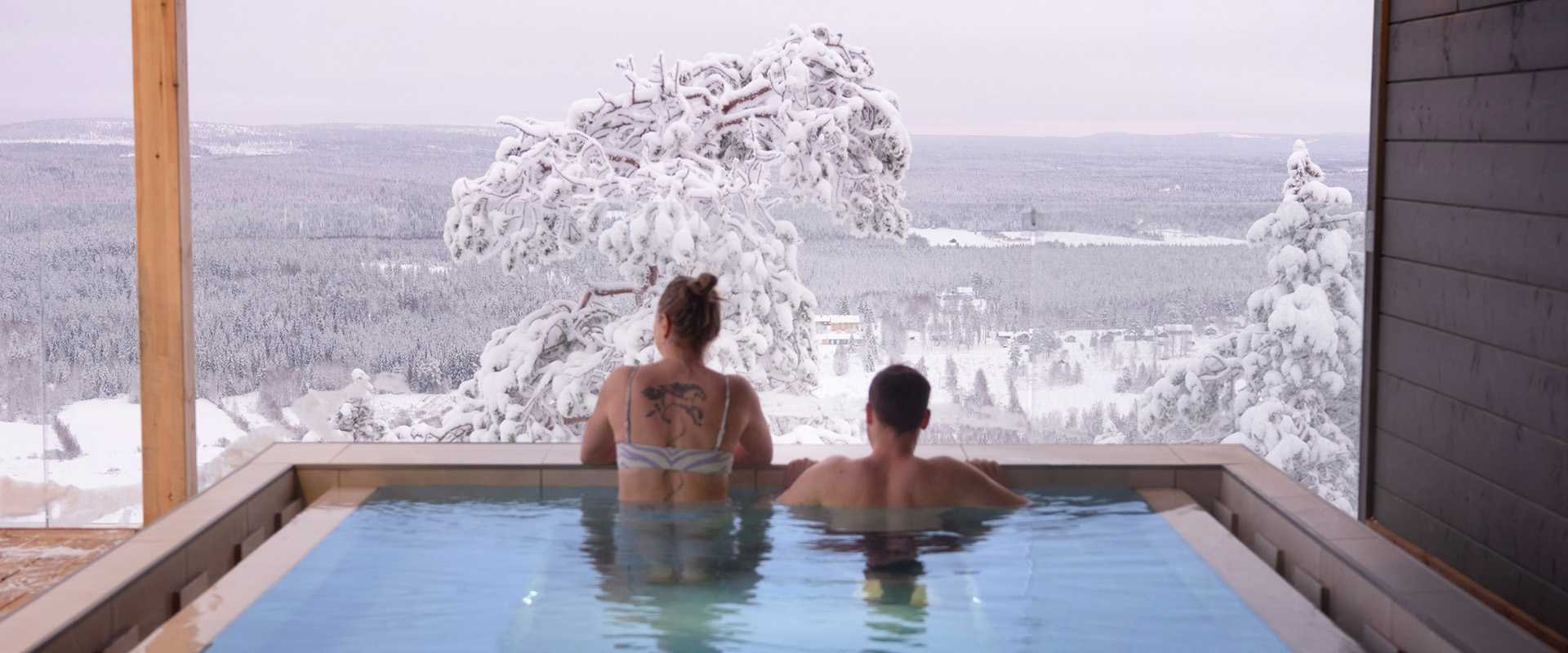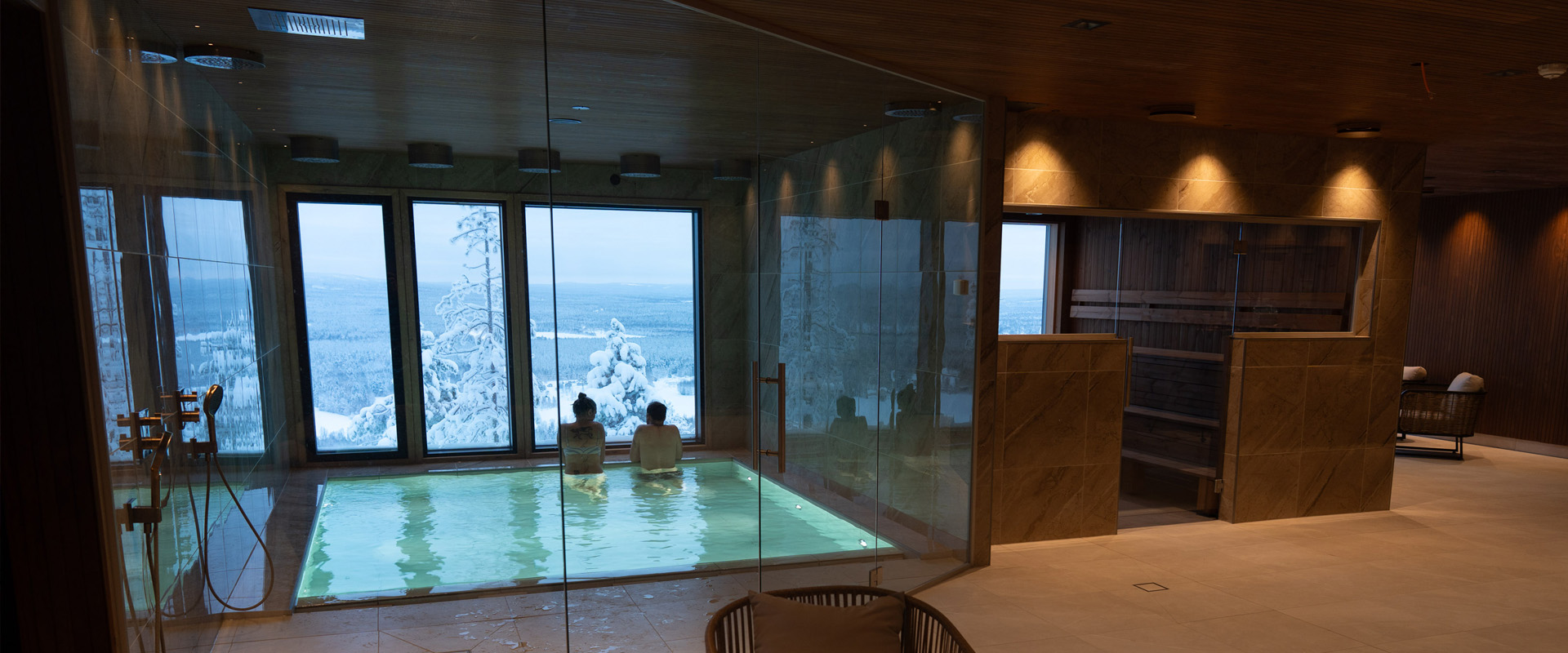 The spa and sauna area invites you to unwind, with indoor and outdoor pools overlooking the Arctic landscape.
