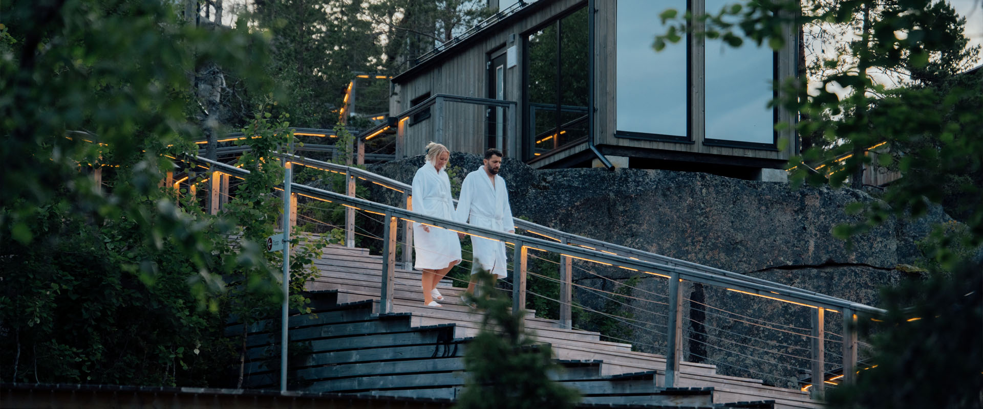 In the two main buildings with an adjoining terrace you'll find the reception, restaurant, bar and a cozy lounge with fireplace. In our restaurant we embrace the local cuisine and serve meals with local ingredients from Lapland. The buildings and spa area as well as the 40 hotel cabins have big windows for you to fully enjoy the breathtaking views over the snowy treetops, the Torne River Valley and the wide area.